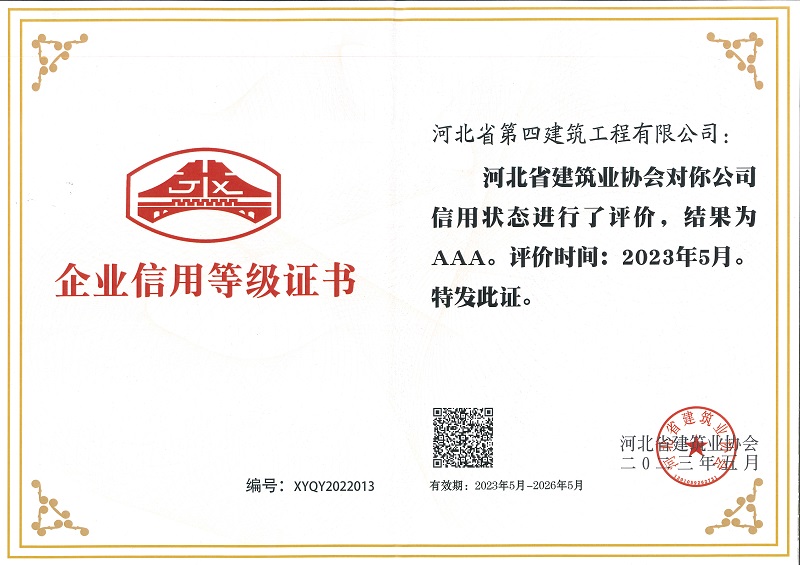 公司自成立以来,始终注重诚信机制建设,坚持贯彻诚信经营理念,以诚信彰显国企担当,在河北四建领域取得了明显成效,连续多年荣获河北省建筑业协会、中国建筑业协会、中国施工管理企业协会的“AAA级信用企业”,以及中国建设银行“AAA信用等级”、国家税务总局“纳税信用A级企业”、河北省建设工程招标投标协会“招标投标诚实守信5A级施工企业”等荣誉称号,公司形象和社会美誉度不断提升。(综合办公室)